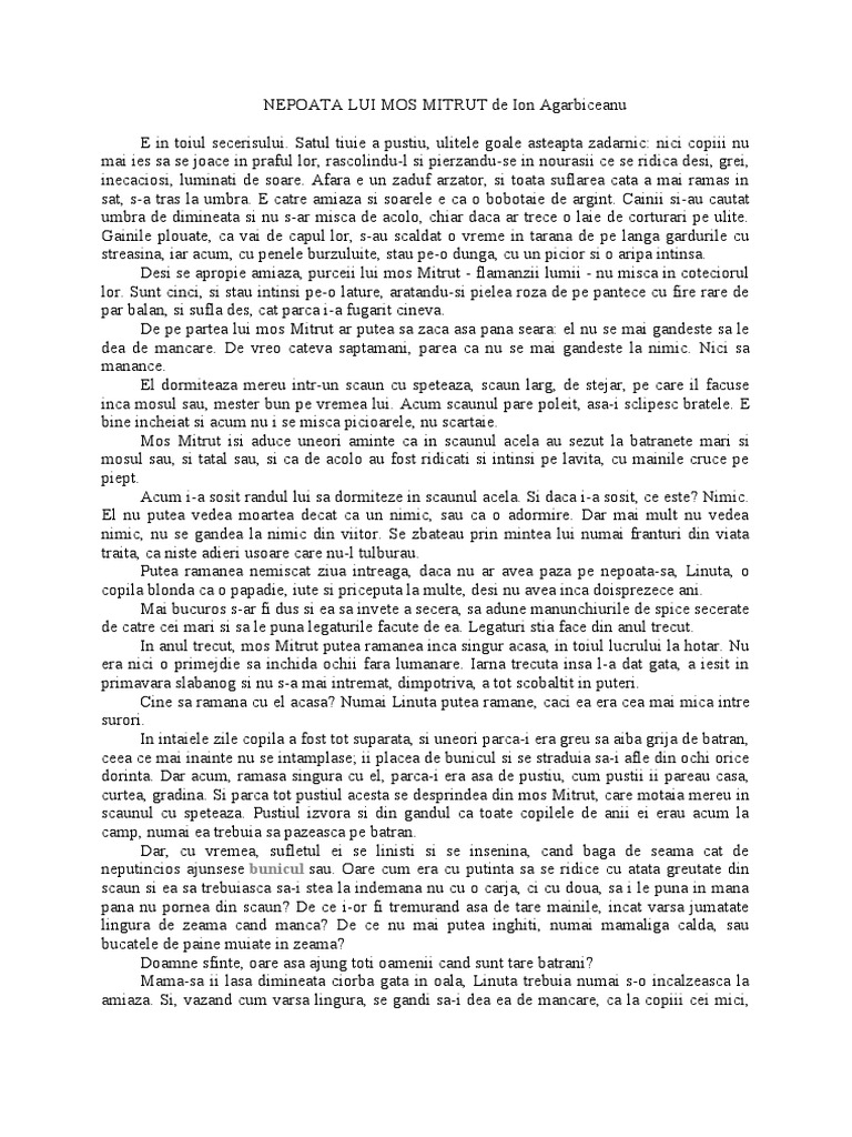 De Ce Linuta Ion Agarbiceanu Nepoata Lui Mos Mitrut Incearca Sentimente De Spaima Cand Ramanea Brainly Ro