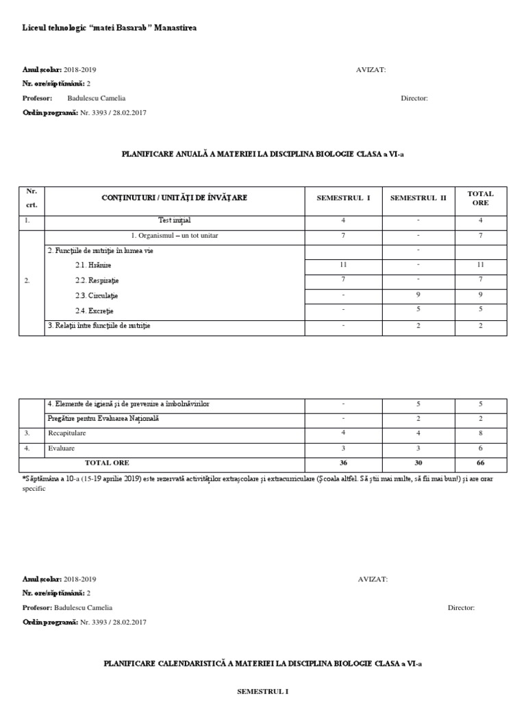 Planificare Biologie Clasa A Vi A 2019 2020 Jurca Flori 16 09 2019
