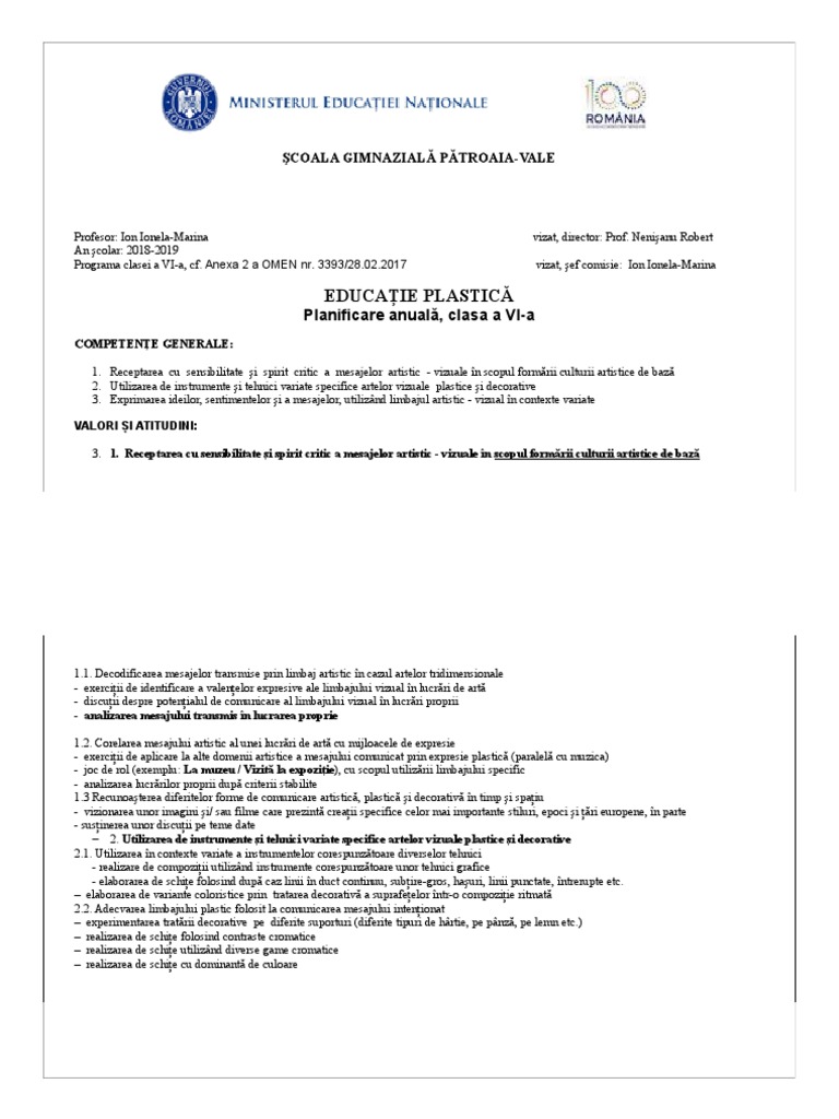 Planificare Ed Plastica Clasa Ava Pitigoiandreea 24 09 2018