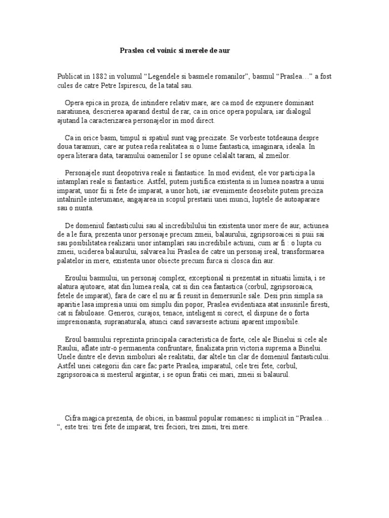 Argumentare Specie Basm Popular Praslea Si Merele De Aur Docx