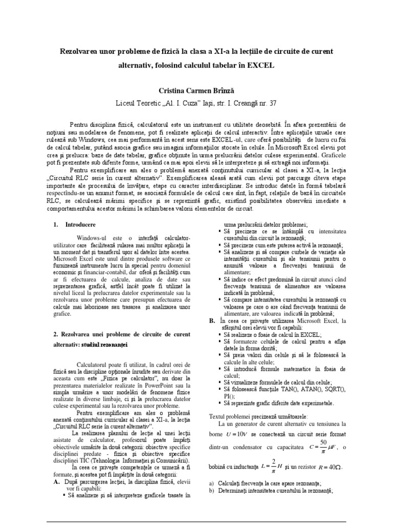 Rezolvarea Unor Probleme De Fizica La Clasa A Xi A La Lectiile De Circuite De Curent Alternativ Folosind Calculul Tabelar In Excel