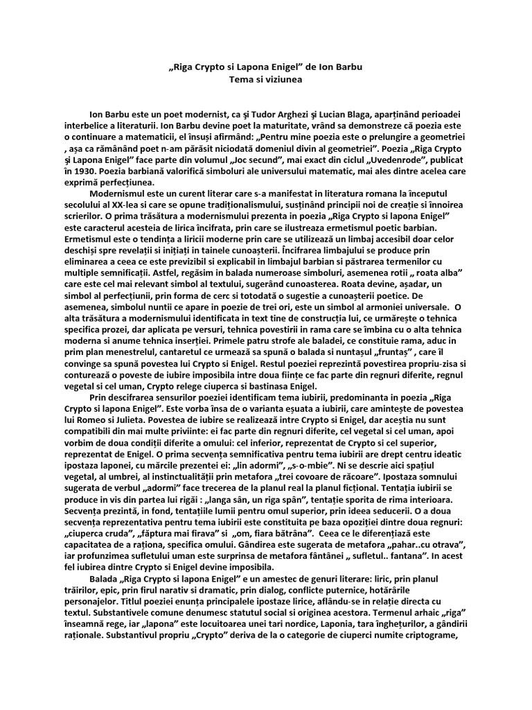 Modernism Ion Barbu Riga Crypto Si Lapona Enigel Docx