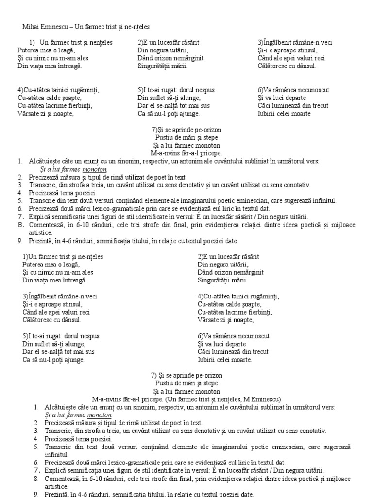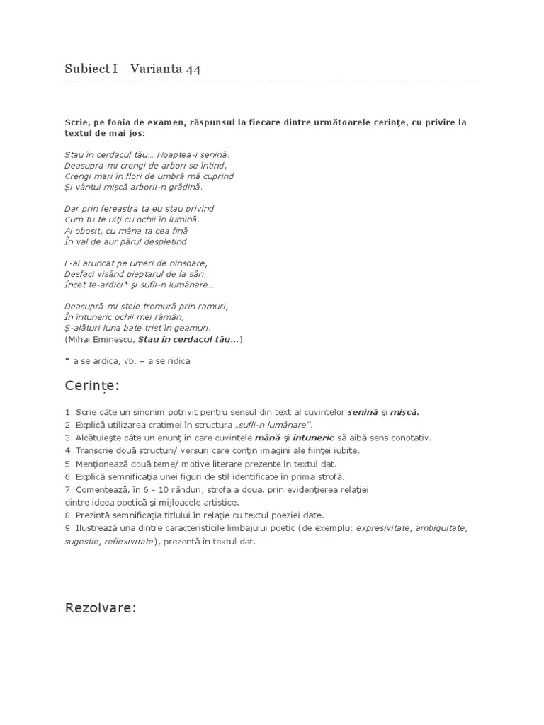 Varianta 44 Subiect I Bac 2013 Mihai Eminescu Stau In Cerdacul Tău