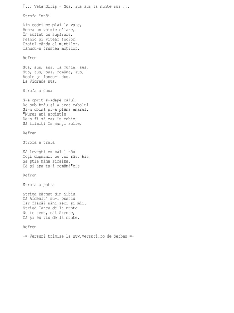 Sus Sus Sus La Munte Sus Versuri