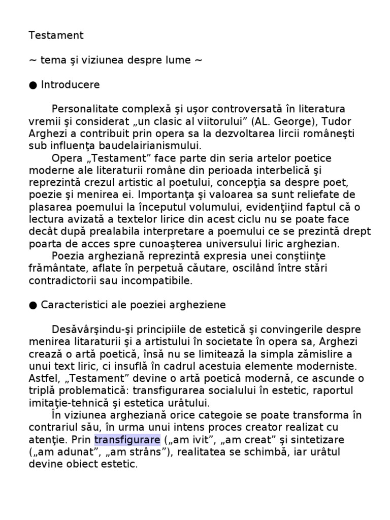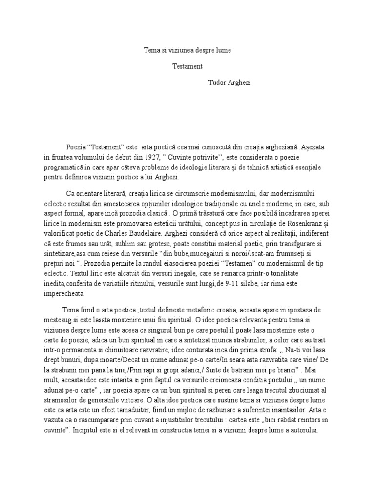 Testament Eseu Despre Tema Si Viziunea Despre Lume